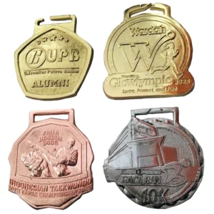 Layanan kami menyediakan medali dalam tiga warna utama — emas, perak, dan perunggu — sehingga sangat cocok untuk event juara 1, 2, 3. Sebagai contoh, produk medali emas tersedia dengan bahan kuningan & sepuh emas/perak/perunggu.